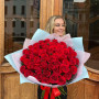 На фото букет из 45 красных роз. В составе: роза 45 шт, дизайнерская упаковка 1 шт, атласная лента 1 шт, . Все цветы свежие и ароматные, букет красиво оформлен и отлично подходит для подарка. Доступна доставка цветов или самовывоз.